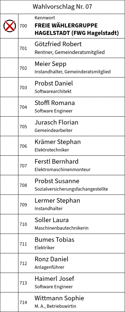 Der Wahlausschuss hat in seiner Sitzung am 20. Januar 2026 unseren Wahlvorschlag geprüft und für gültig erklärt. Damit ist es offiziell: Die Kandidatinnen und Kandidaten der FREIEN WÄHLERGRUPPE HAGELSTADT treten am 08. März 2026 zur Wahl des Gemeinderats an.